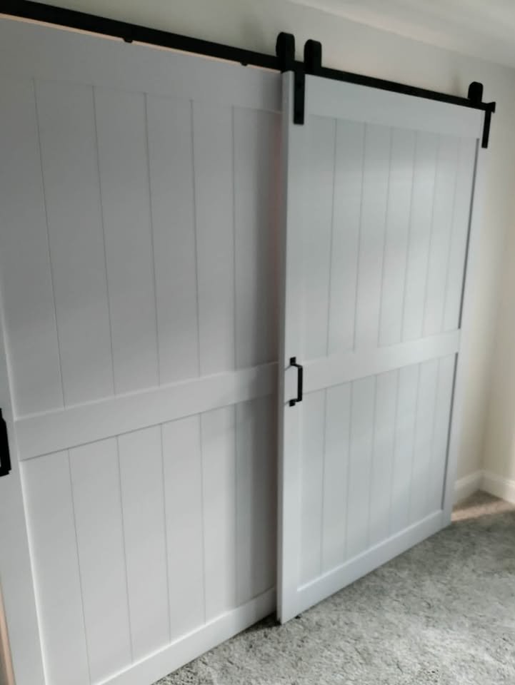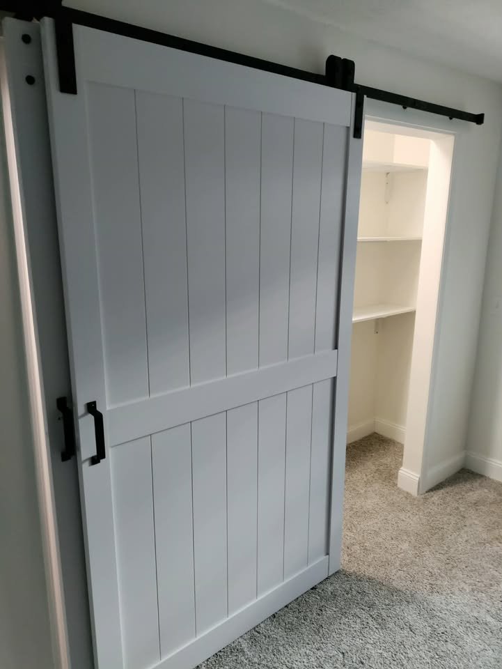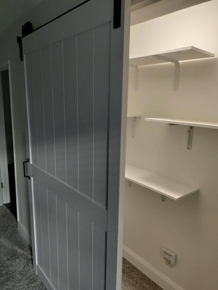 This one was a pretty good one. I don’t have any before pictures unfortunately but we built the whole closet, shelving, closet door, and installed a light and a light switch. Framed out the walls to fit the door, drywall, paint, shelving, baseboards, assembled and installed the door, installed and painted the header board, and hung the door. We ordered the door from Home Depot and had to put it together but it’s a pretty darn good door, we are happy with the product. We respect all of our clients and people in general very much, and we really respect the lady we did this project for. Very sweet and professional. I’ll just say this, she was a pilot, isn’t that cool? I think things like that are pretty cool.