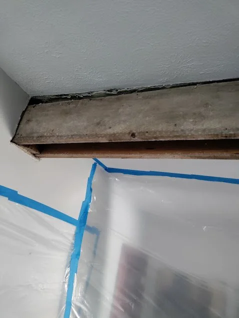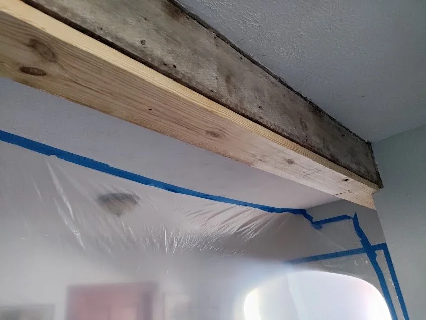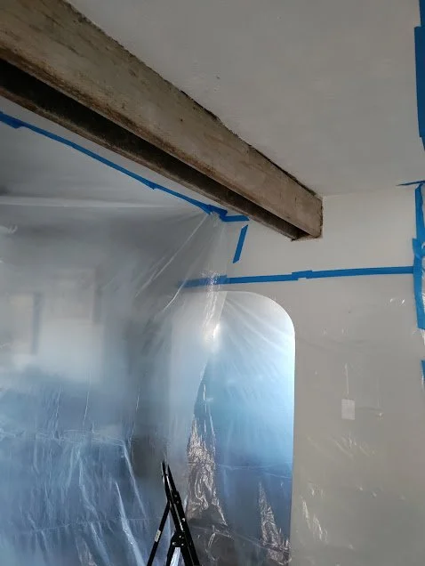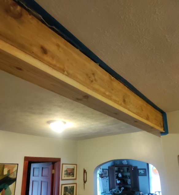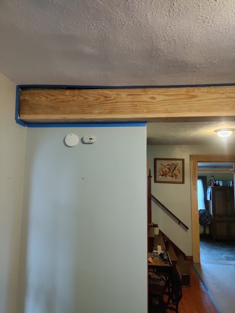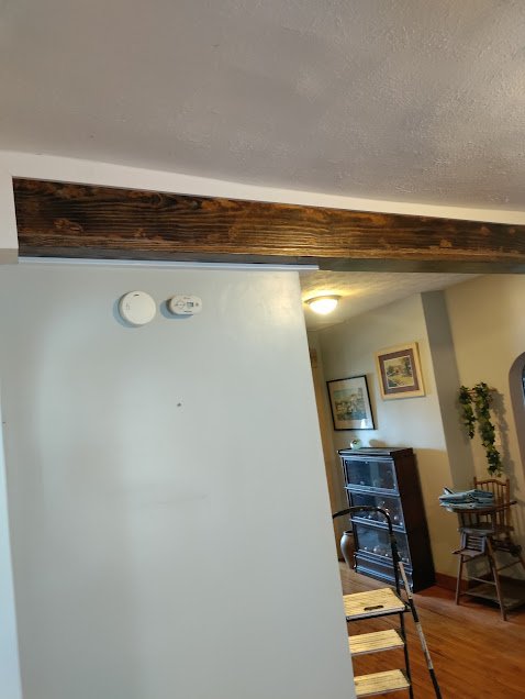 We capped an interior beam with a 2x8, sanded, filled, stained, clear coated, and added white trim. This is a project we did for the same homeowner we built the porch for, this is also January of 26. We created a plastic enclosure around the beam to keep the dust out of the rest of the house.