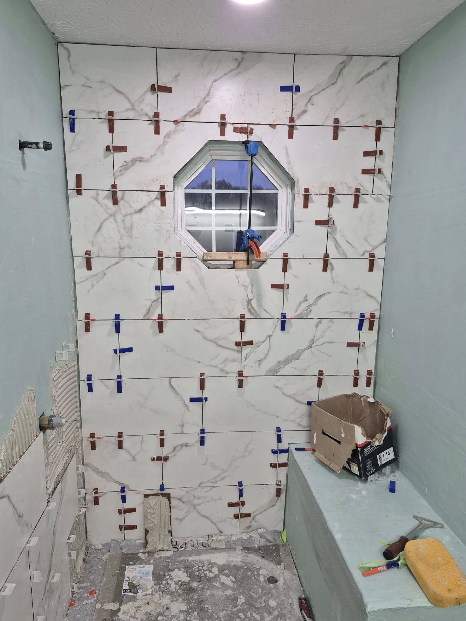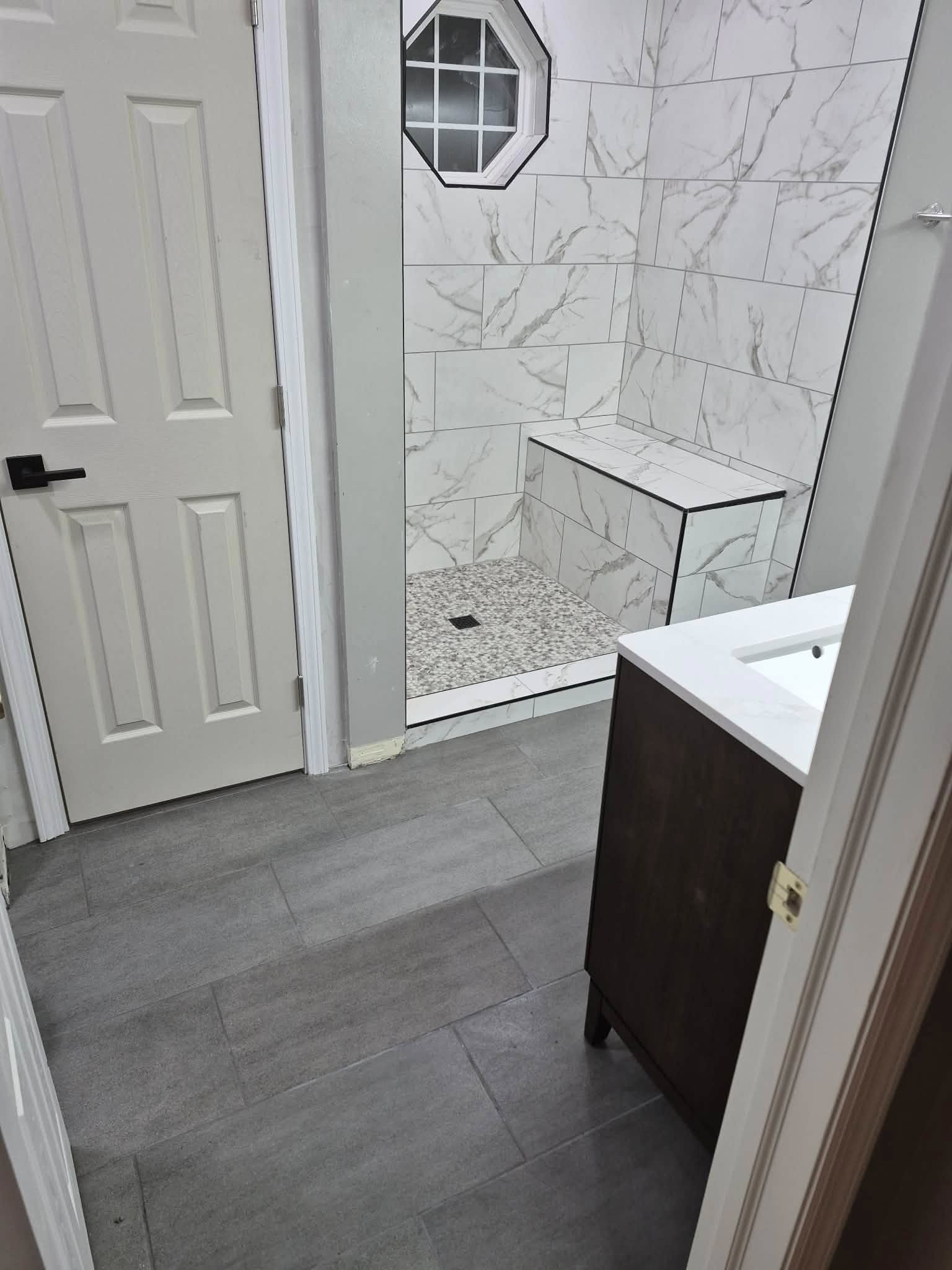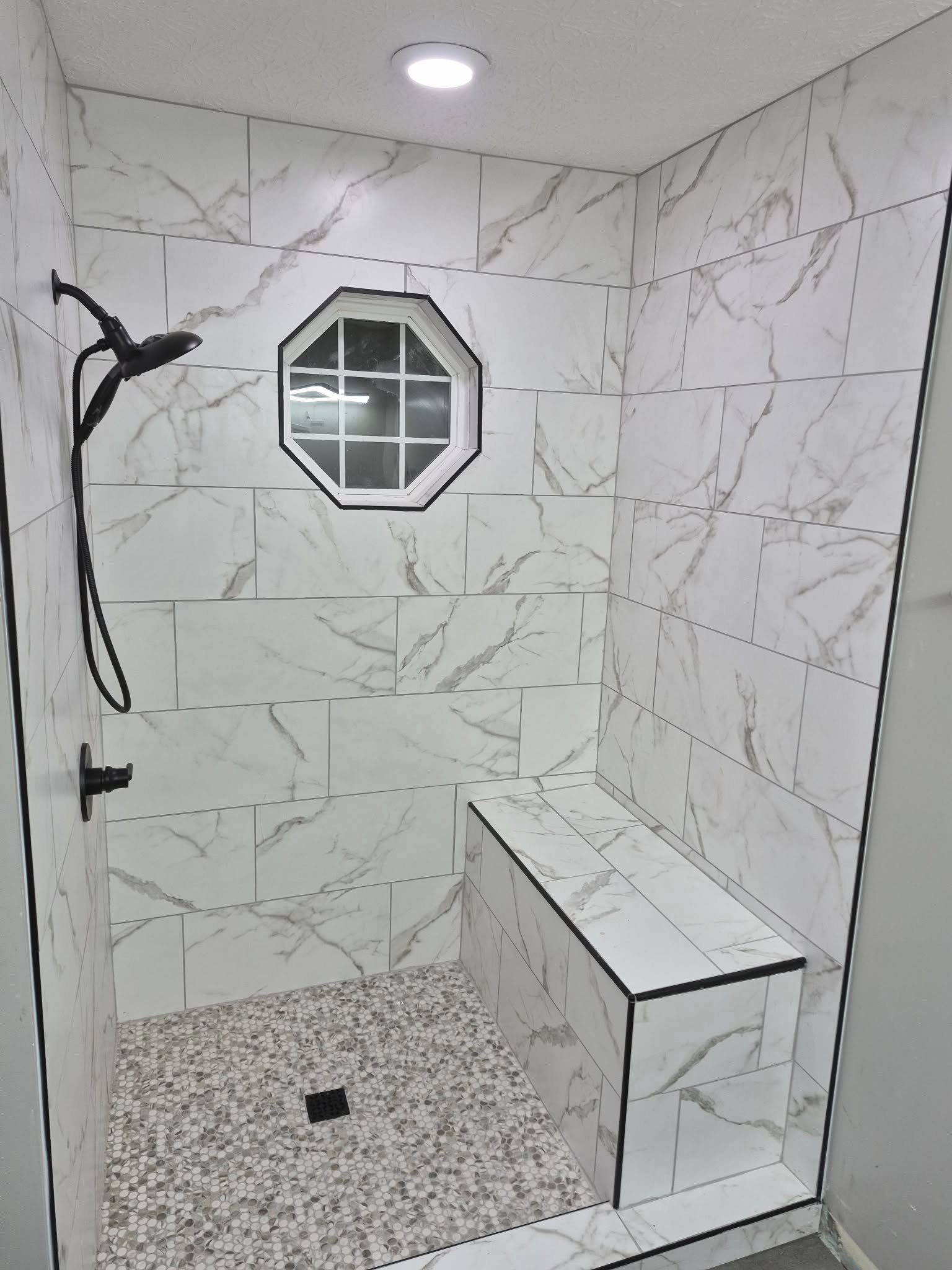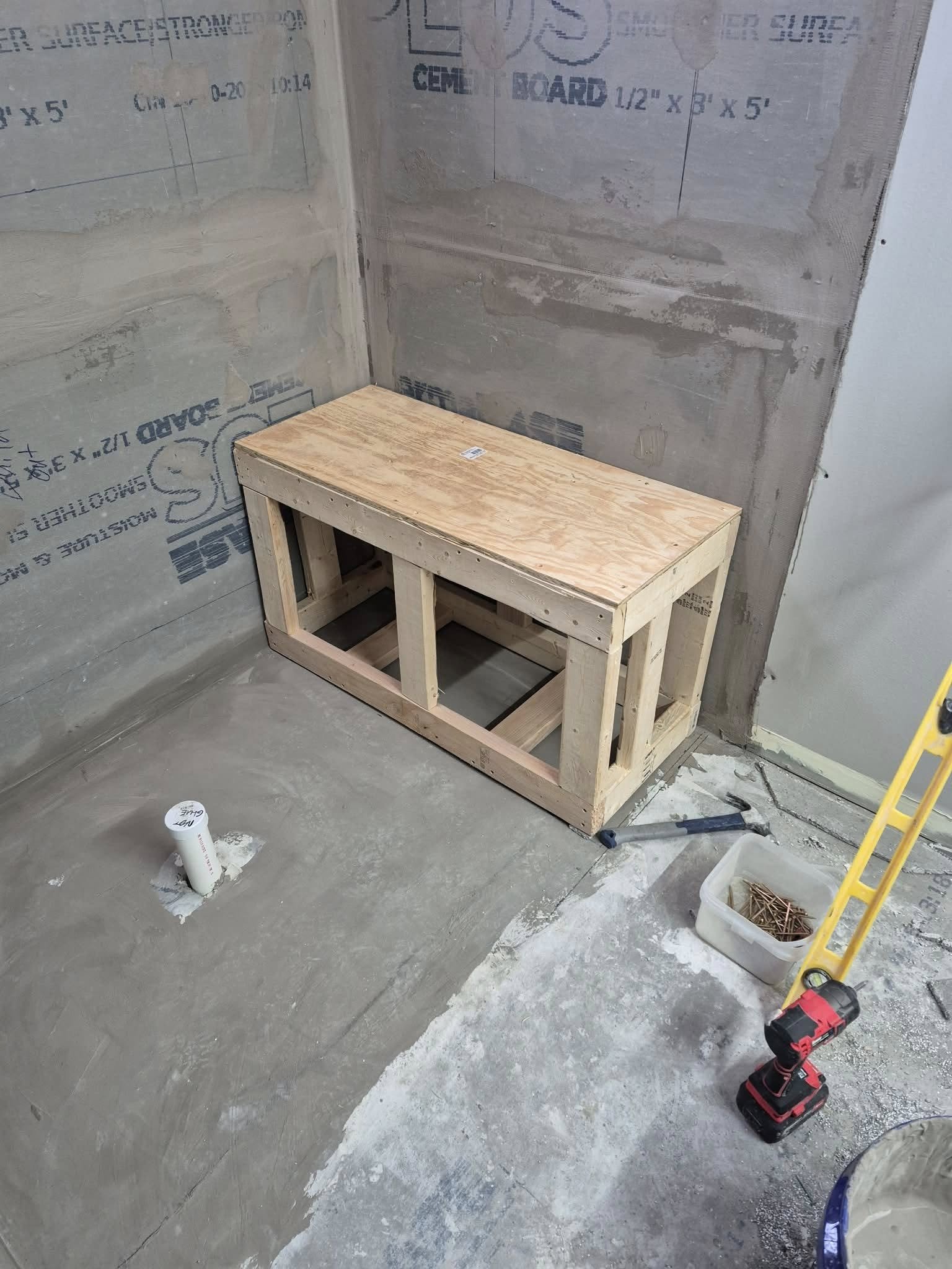 This one was a fun one, building bathroom showers usually is. My brother helped on this one, Thanks John. The door was custom made and installed by a glass company afterwards (shout out to Glass Guru) and I have yet to get the pictures, but this is what we made. Where there once was a tub, there’s a shower with a bench and a curb, where there once was a shower, there’s now a closet with a door. We also installed the flooring. Fun fact, I’ve been doing tile specifically since I was 15 years old. I’ve been a part of installing the flooring in probably a few hundred bath and body works stores around the country, working for an older brother of mine. We even built the Pink! Store in Easton Mall. Gosh that was a lot of work and that was a long time ago. Good memories. We love building things. Give us a call