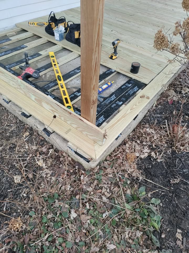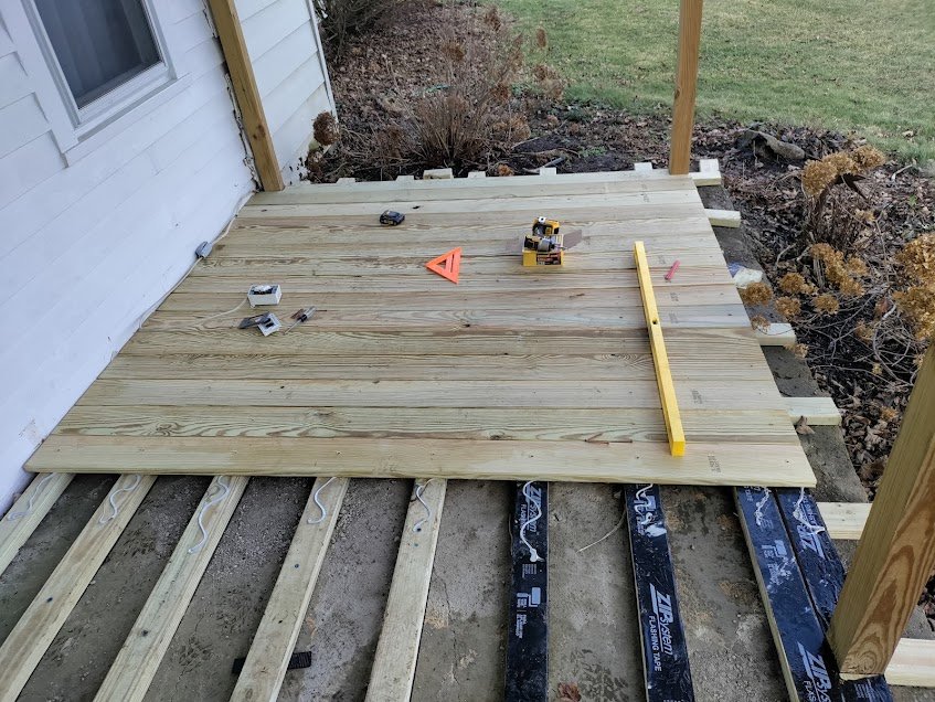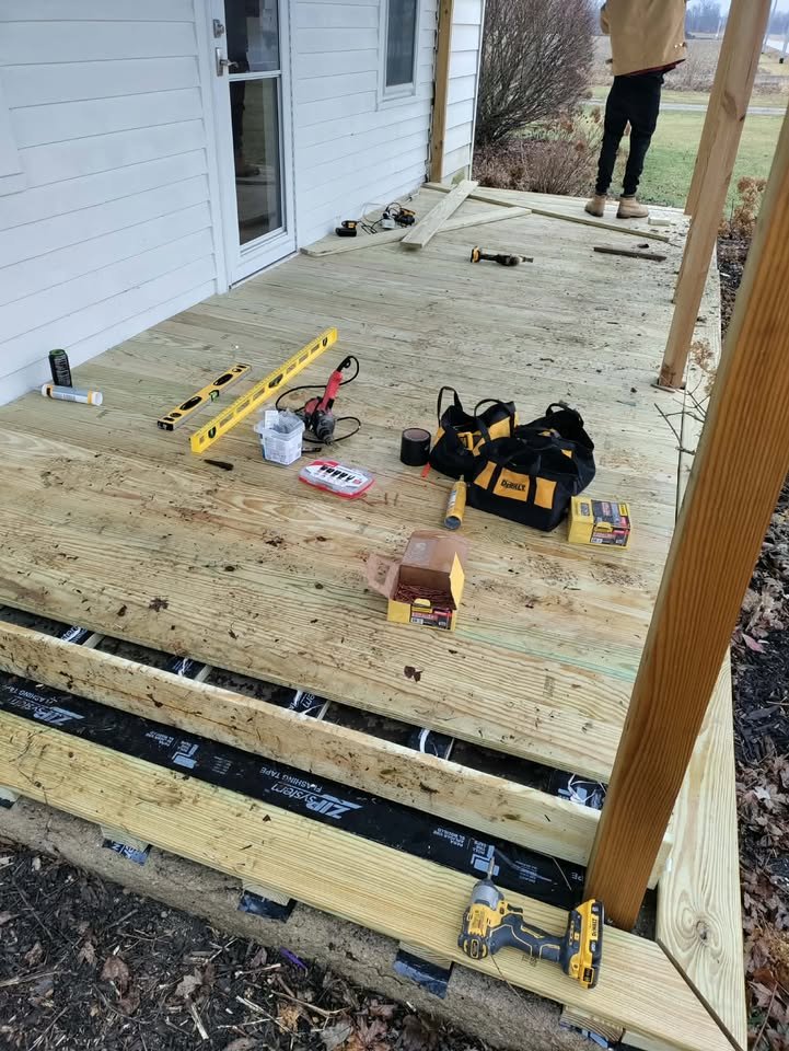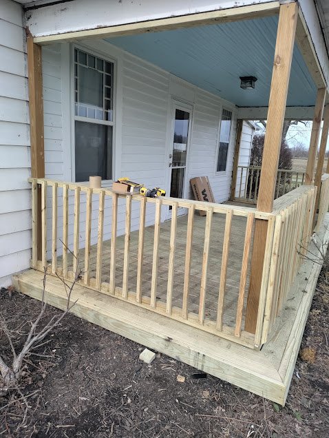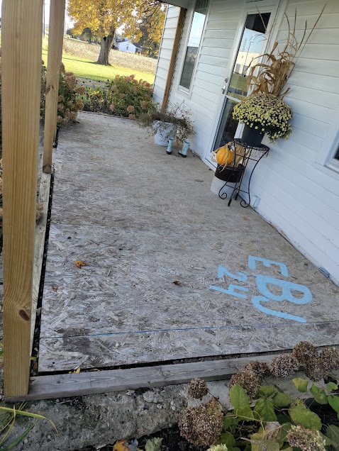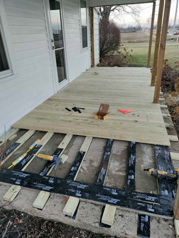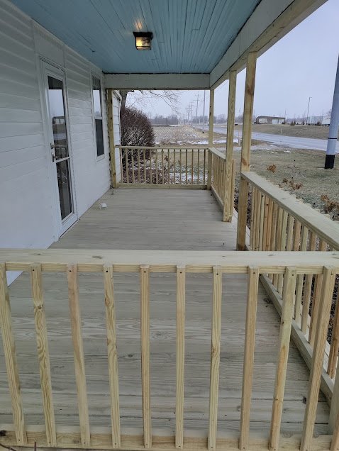 This is a job we did for a customer in early January. It was nice for a few days when we started, and then it got pretty cold. These are before and after photos. The OSB was tap conned into concrete and seemed like it had been for quite some time. It was all rotted and we had to cut the wood away from the screws and break the screws with a hammer. We patched the concrete in some areas, laid weather tape where the concrete meets the wood joists (where we used PT 2x4s laid on their side) and put joist tape on top of the joists several feet in from the outer edges of the porch (Even the small pieces on the outside, they were taped after the pictures were taken). Then we ran an orbital sander, a pass with a 60 grit sandpaper and a pass with a 100 grit sandpaper over the handrails, spindles, posts, porch fascia and the frieze board, then we ran a floor sander over the rest. Will be giving the wood a few months before we stain it, and paint the rest of the porch. It’s going to look great, stay tuned!