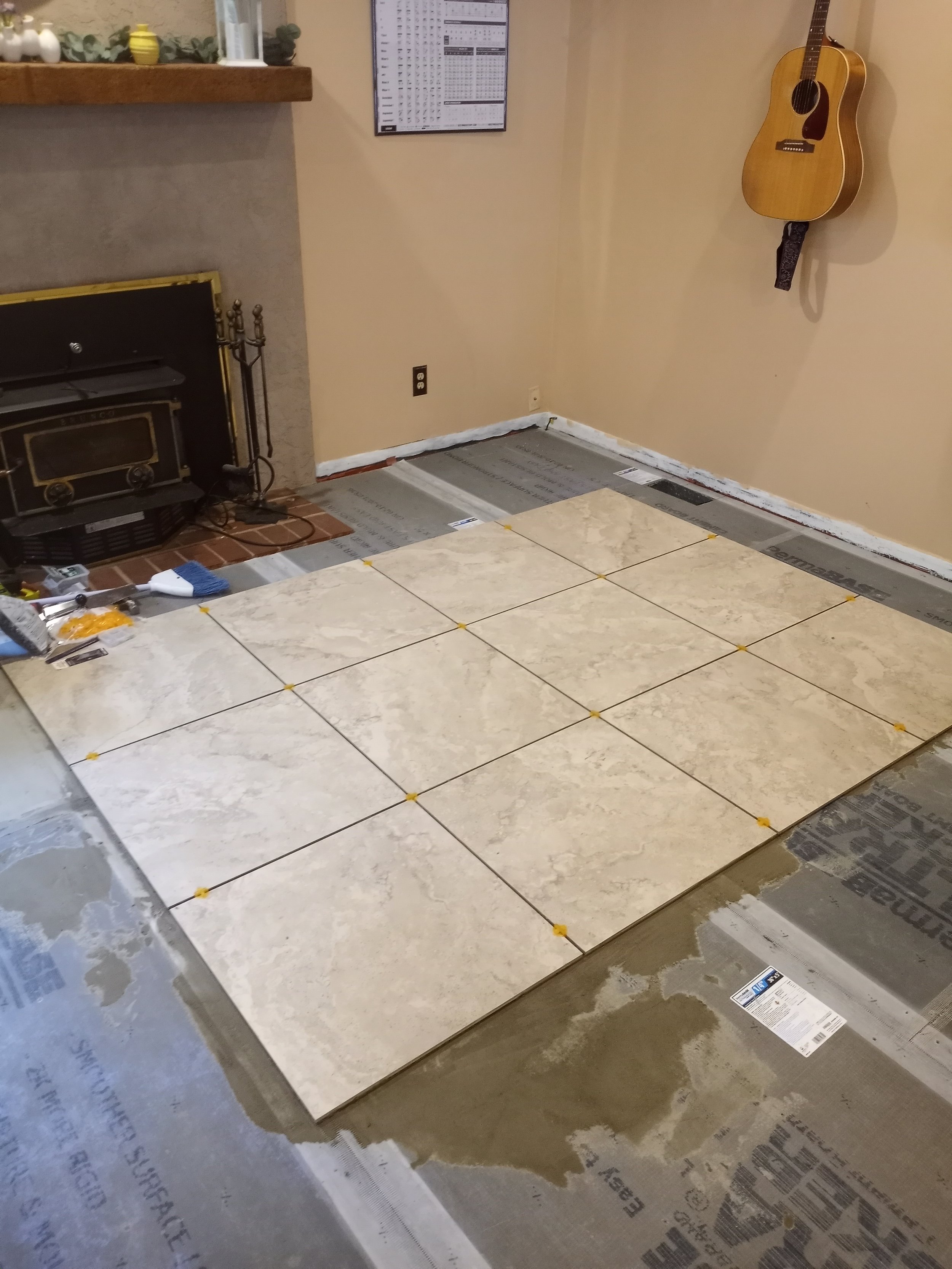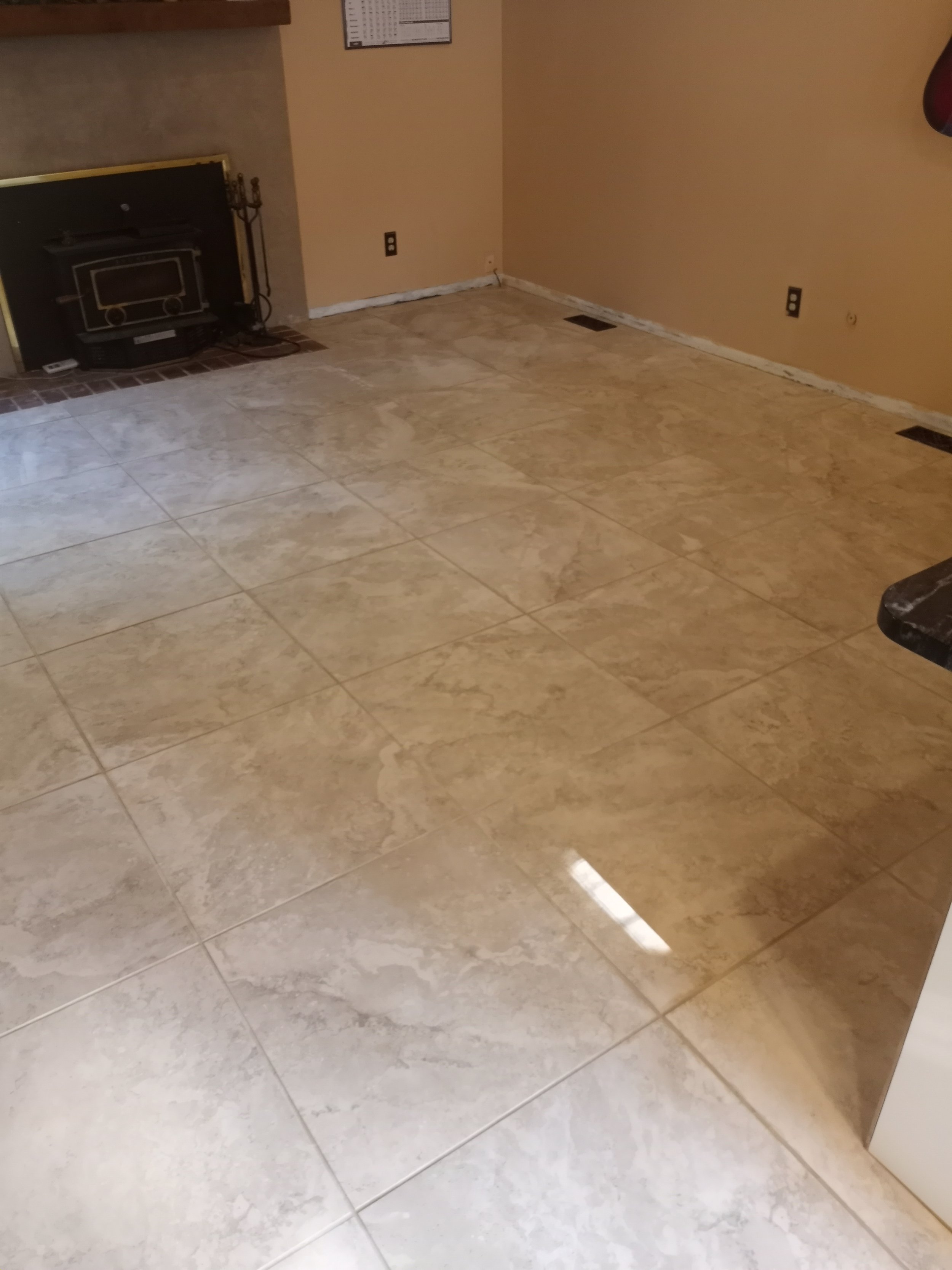 This one was back in 2021. 2 ft x 2 ft porcelain tiles. I still remember I had to rent a wet saw from home depot because the one I owned at the time wasn’t big enough to cut them. The whole thing was fun though, I did it by myself. Subfloor prep, Cement board, cutting, mudding, tiling, grouting. It was probably more than 500 sq ft so the whole thing took me a few days but we got it done and it was a good experience. The homeowners also said that what was there before was kind of like a green shag 1970s carpet. So I guess it’s quite the upgrade. I like it.