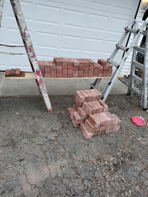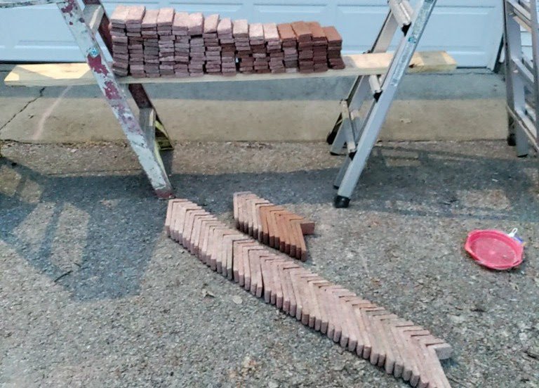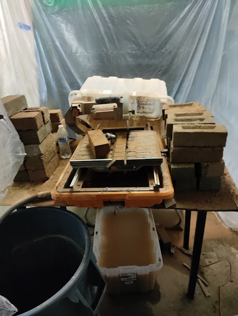 Back in February 2025, I met a guy who hired me to cut several hundreds of flat veneer bricks out of whole bricks for a chimney. There was something like 5 or 600 flat pieces needed, and almost 200 corners needed. It was cold, so I set up a wet saw station inside of the garage. This was the idea,